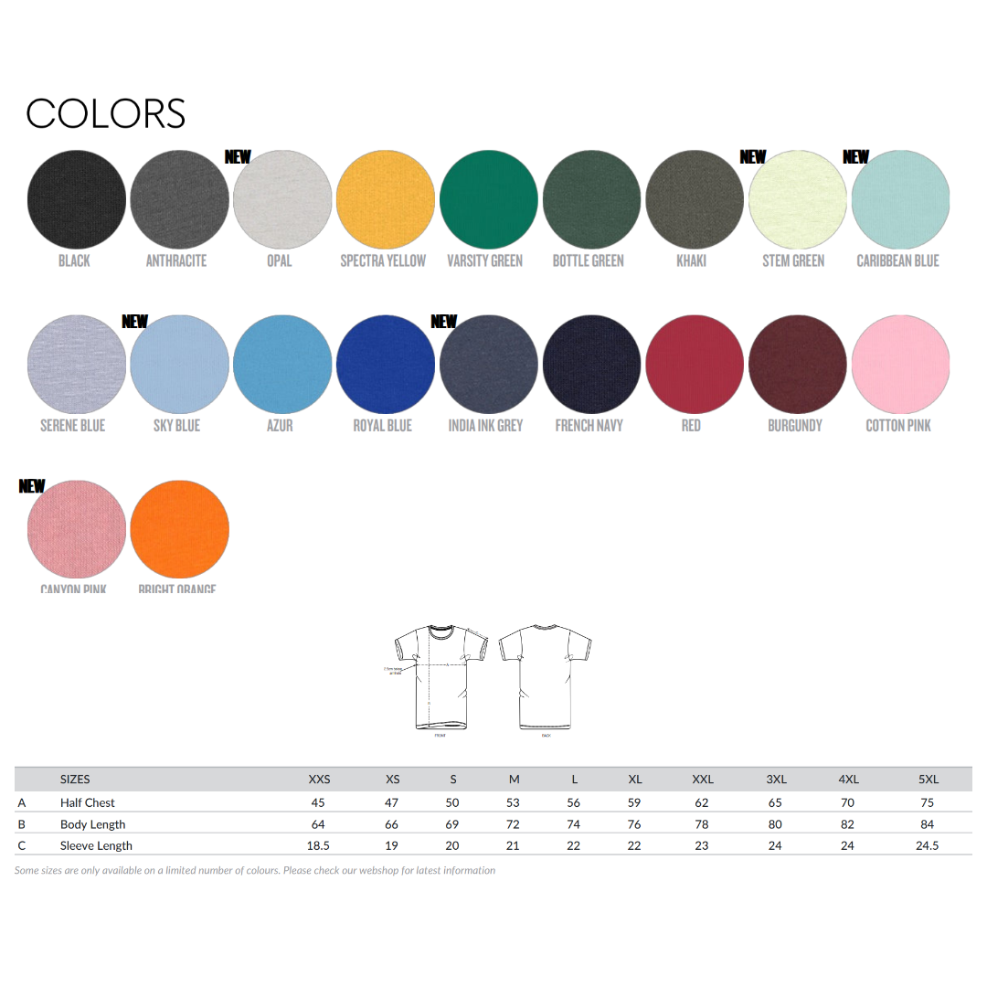| COLOR | ANTHRACITE, AZUR, BOTTLE GREEN, BRIGHT ORANGE, BURGUNDY, CARIBBEAN BLUE, COTTON PINK, FRENCH NAVY, INDIA INK GREY, KHAKI, OPAL, RED, ROYAL BLUE, SERENE BLUE, SKY BLUE, SPECTRA YELLOW, STEM GREEN, VARSITY GREEN, BLACK, CANYON PINK, WHITE |
